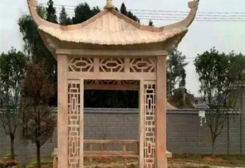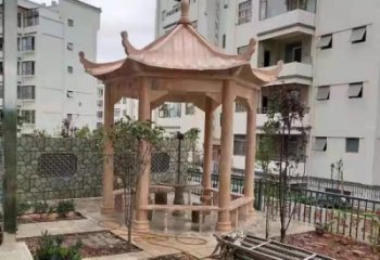 紅石雕鏤涼亭,晚霞中空中創(chuàng)意雕塑